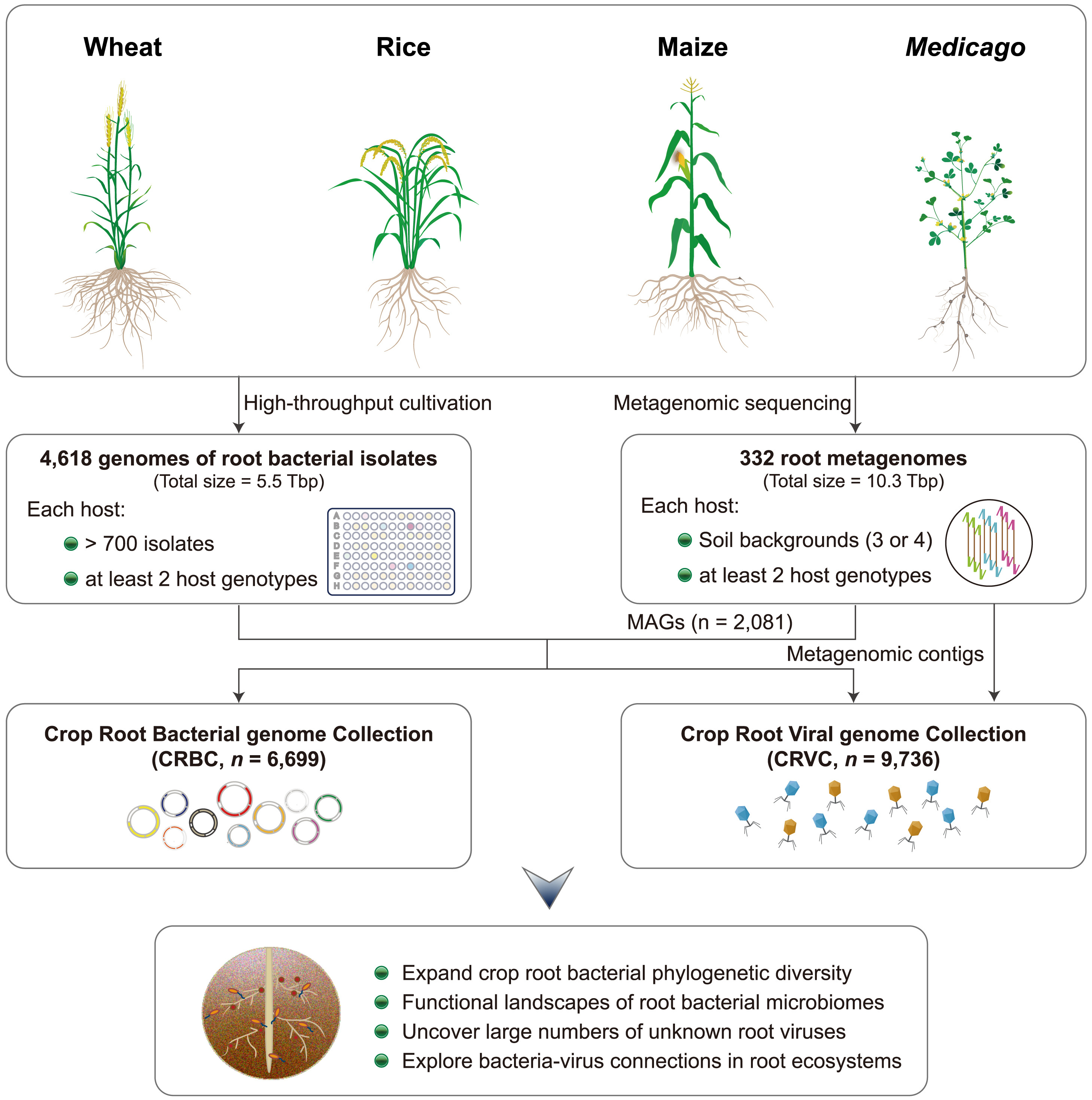 Root microbial reference genomes are crucial for metagenomic analysis and in-depth studies of crop root microbiomes. By integrating high-throughput bacterial cultivation with metagenomic sequencing, we systematically developed a comprehensive Crop Root Bacterial Genome Collection (CRBC) and Crop Root Viral Genome Collection (CRVC) from wheat, rice, maize, and Medicago.
